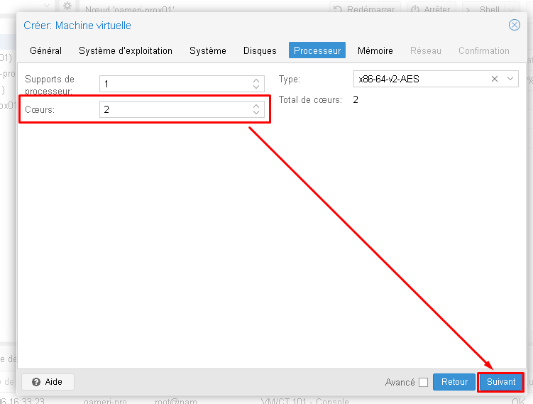 Nous allons sélectionner le nombre de vCPU alloué à notre machine virtuelle. Ici ce sera 1 socket pour 2 coeurs.