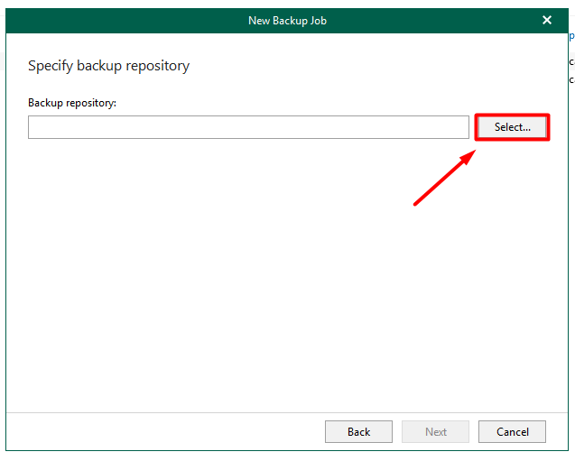 Les sauvegardes sont déposé sur un emplacement nommé le Backup Repository. Nous devons alors sélectionnez notre Backup Repository en cliquant sur Select…