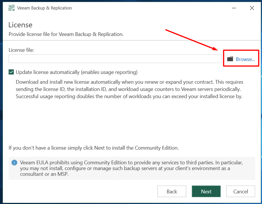 Il vous sera proposé d’ajouter votre licence Veeam (sous forme d’un fichier .lic). Cette étape est optionnelle, vous aurez la possibilité de l’ajouter ultérieurement.