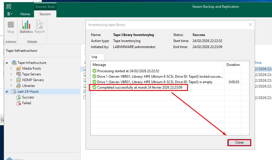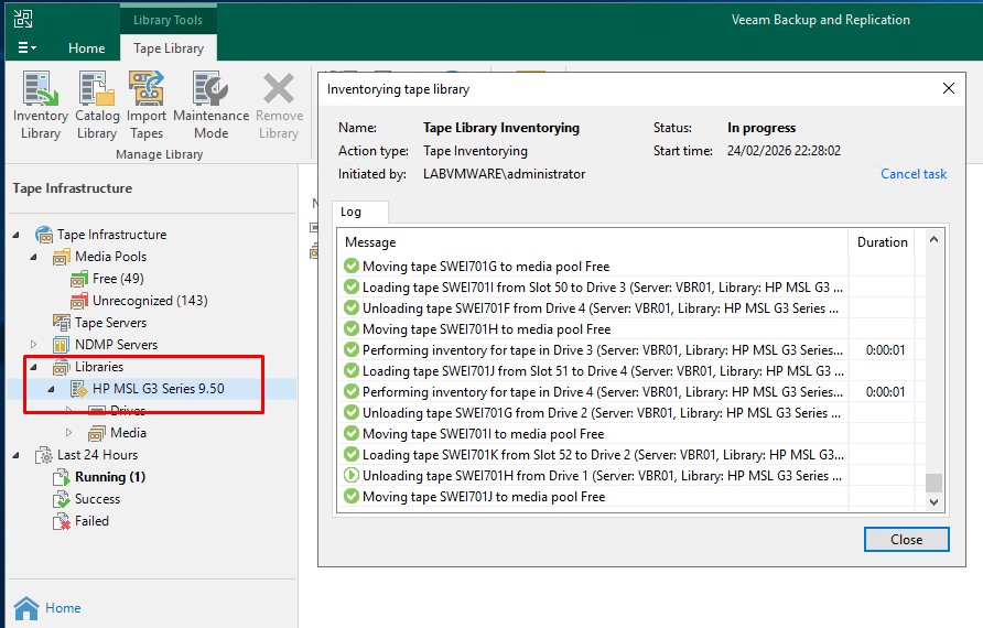 Veeam va procéder à l’inventaire des bandes au sein de la librairie. Vous pouvez voir le travail en cours dans Tape Infrastructure puis Last 24 hours puis Running. Il y a un job en cours.