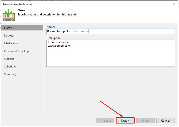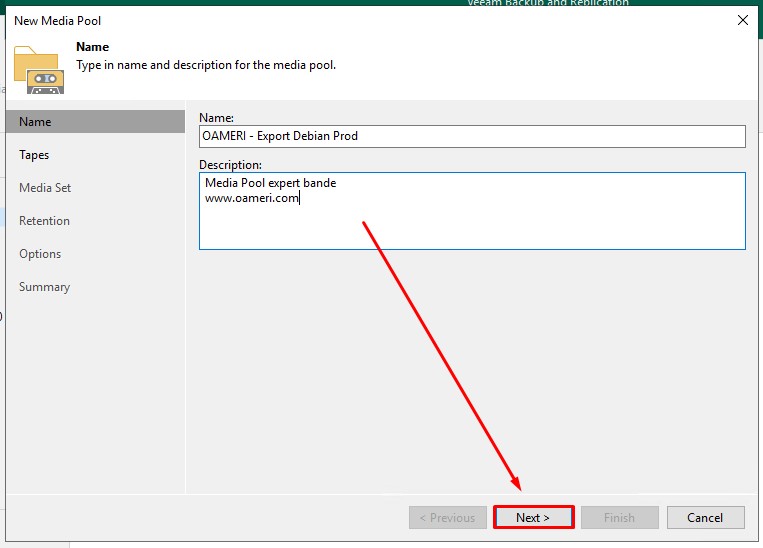 Entrez le nom de votre Pool de Media (ici OAMERI – Export Debian Prod) et une description. Il nous permettra de le retrouver facilement dans la configuration de Veeam.