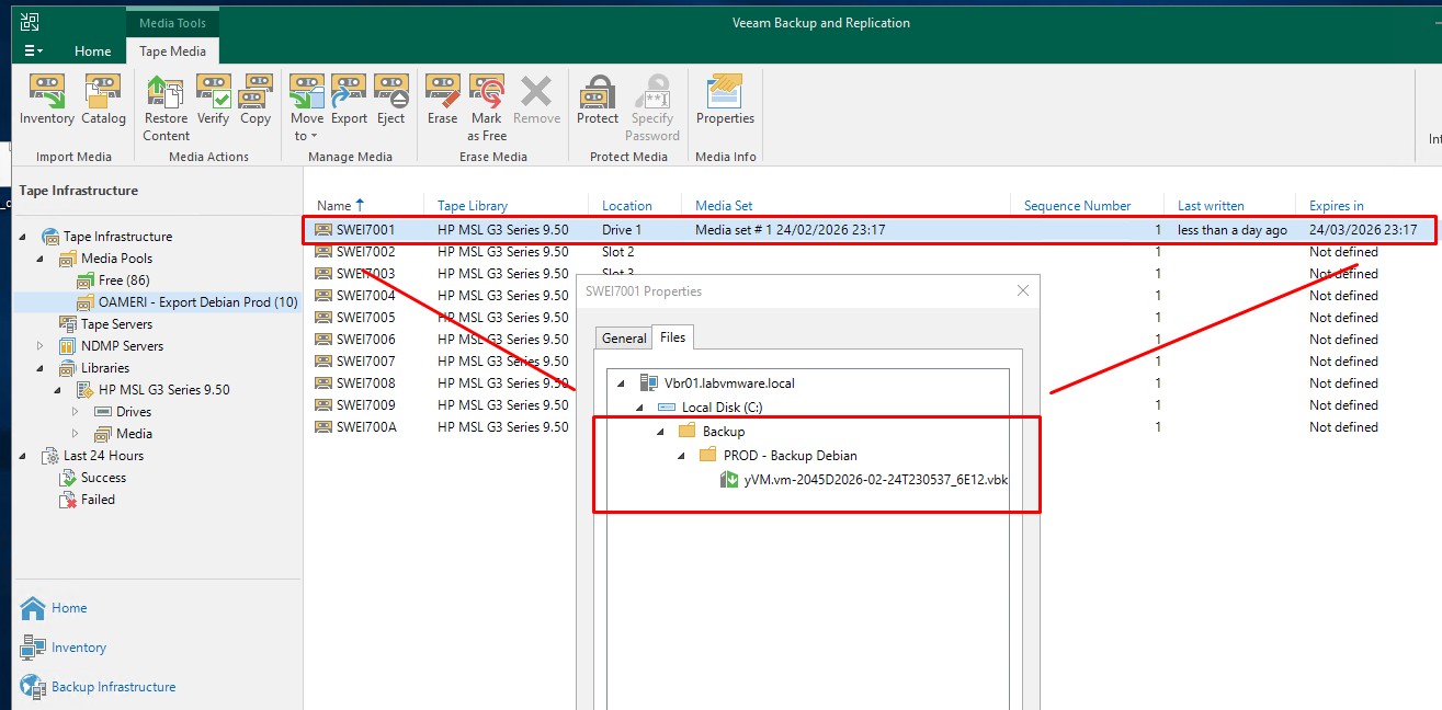 Une bande LTO a été utilisé, et elle contient le fichier de sauvegarde .vbk de notre Backup Job.