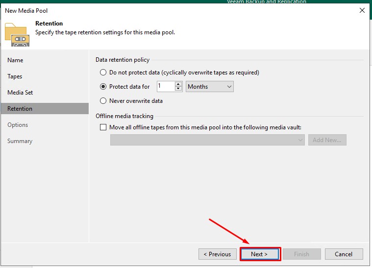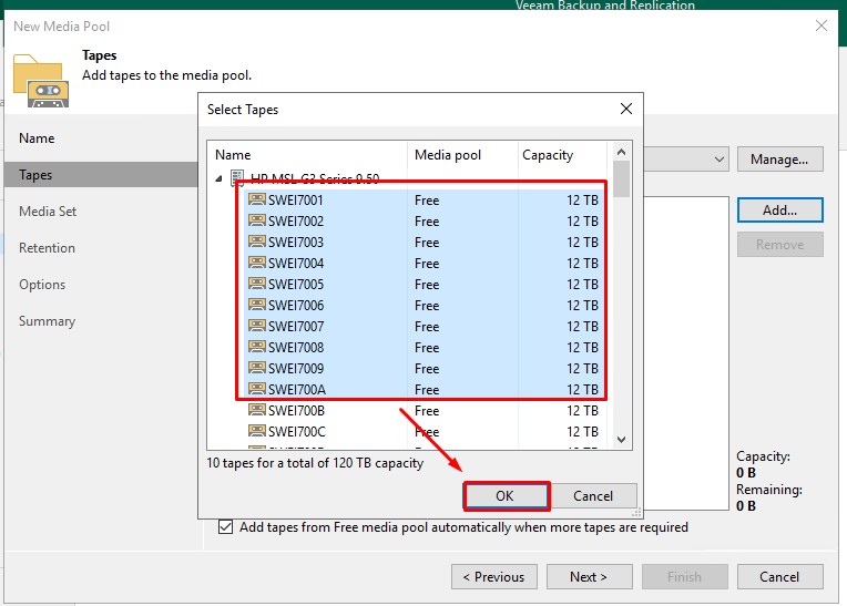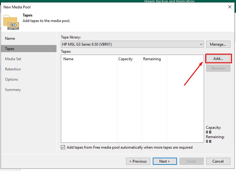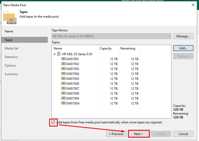 En cochant la case Add tape from Free media pool automatically when more tapes are required, Veeam ajoutera des bandes du pool « free » à chaque fois qu’il en aura besoin.