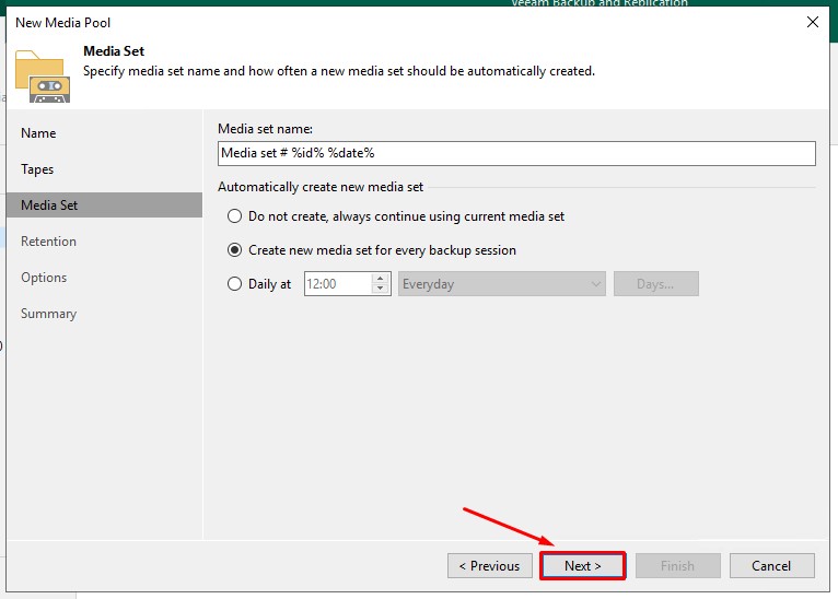 L’option Automatically create new media set est très importante. Vous avez les possibilités suivantes :