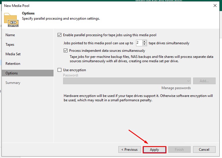 En cochant Enable parallel processing for tape jobs using this media pool, vous permettez à Veeam d’écrire en utilisant plusieurs tête de lecture sur plusieurs bande en même temps.