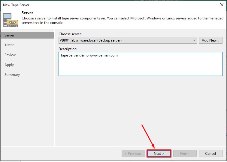 Sélectionnez votre serveur Veeam et ajouter une description puis cliquez sur Next >