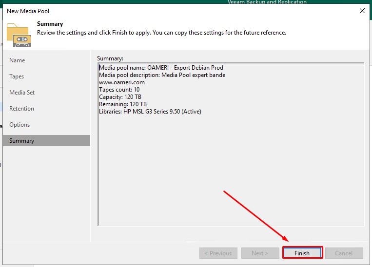 Cliquez sur Finish pour valider la création du Pool de Media.