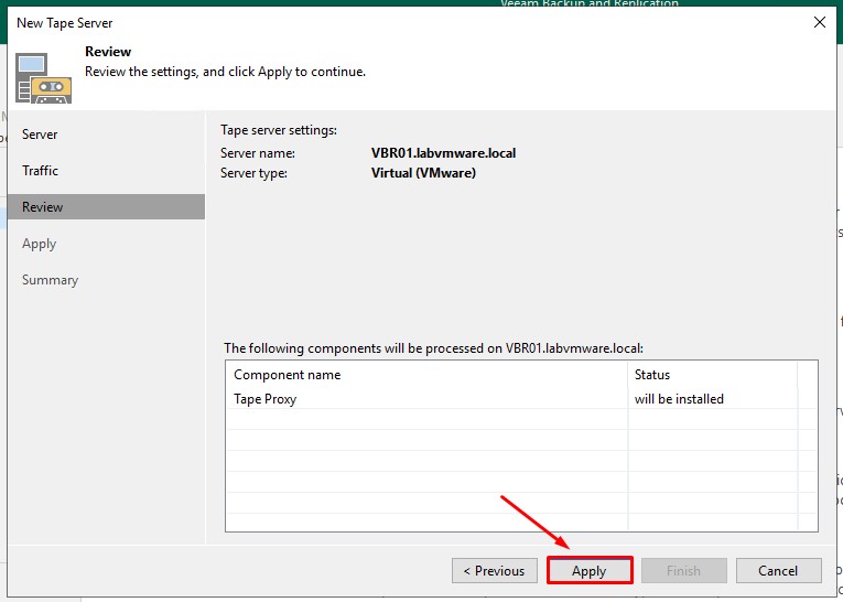 Le rôle Tape Server doit être déployé lors de la première configuration. Ce serveur possèdera la connexion à votre robotique LTO et fera le lien physique entre Veeam et la robotique.