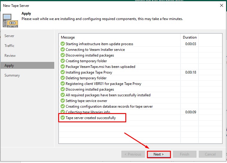 L’installation des composants nécessaire au Tape Server a bien été effectué sur le serveur. Cliquez sur Next >