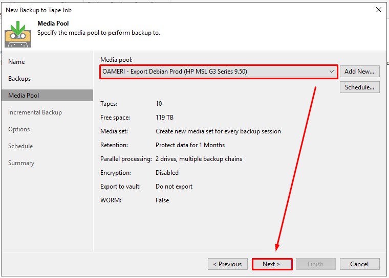 Sélectionnez ensuite le pool de media précédemment créé qui contiendra les incrémentales et cliquez sur Next >