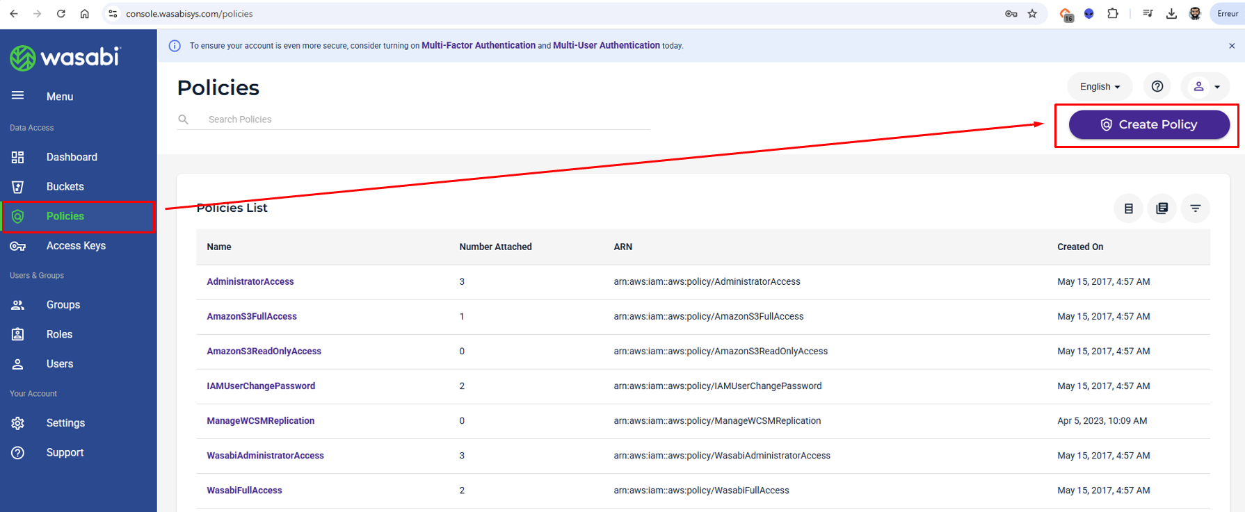 - Création d’une Policy Wasabi