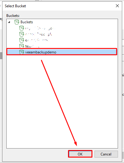 La liste des buckets disponible s’affiche, sélectionnez le votre (ici veeambackupdemo) et cliquez sur OK.