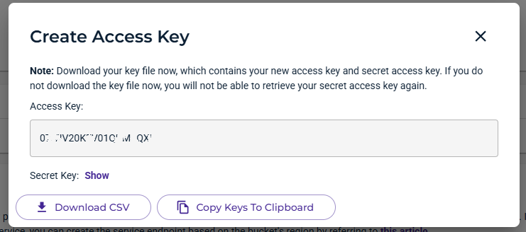 Attention : vous ne pourrez avoir accès à la clé d’accès et sa secret key uniquement lors de la création. Si vous ne copiez pas, ou ne téléchargez pas le .CSV à ce moment la, il ne reste plus qu’a créer une nouvelle clé.
