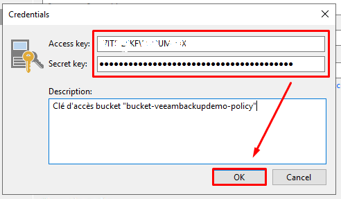 Conservez la, elle sera utilisé sous Veeam Backup pour la configuration de l’accès au bucket.